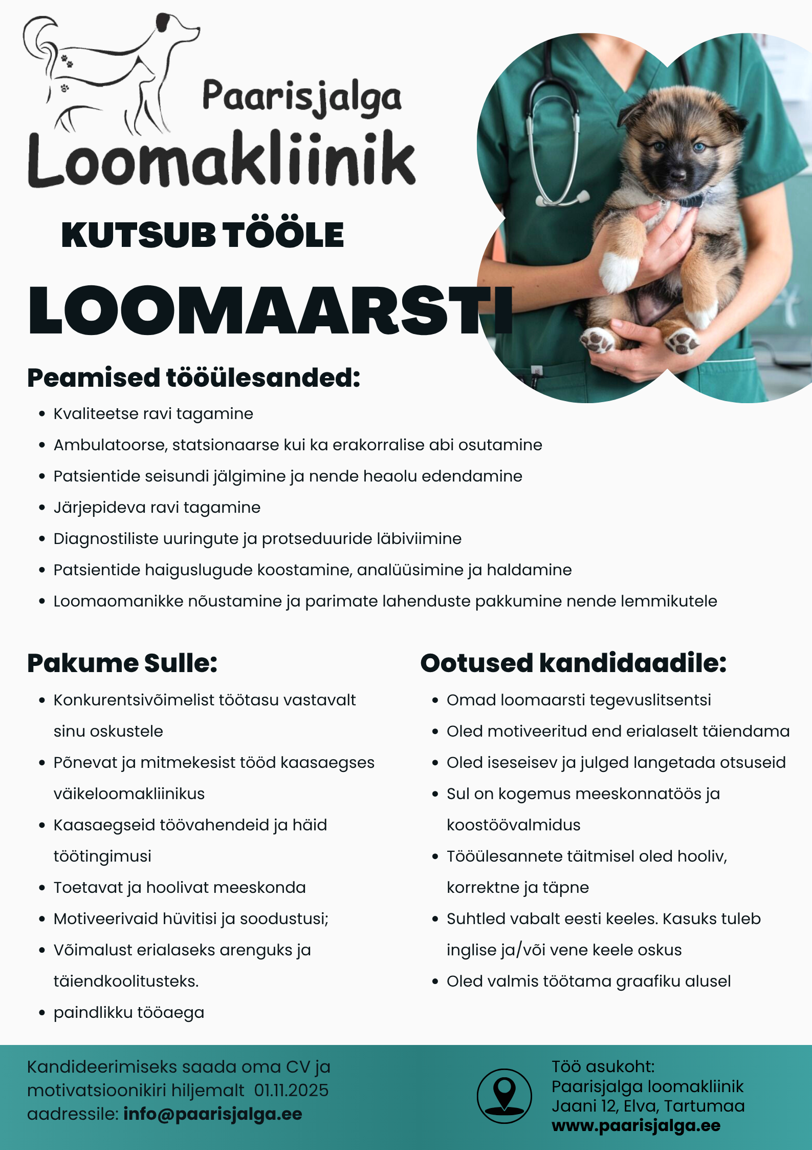 Tere tulemast Paarisjalga OÜ kodulehele! Paarisjalga OÜ on Elvas asuv loomakliinik, mis tegeleb Teie neljajalgsete sõprade haiguste ennetamise, diagnostika ning raviteenuste pakkumisega.